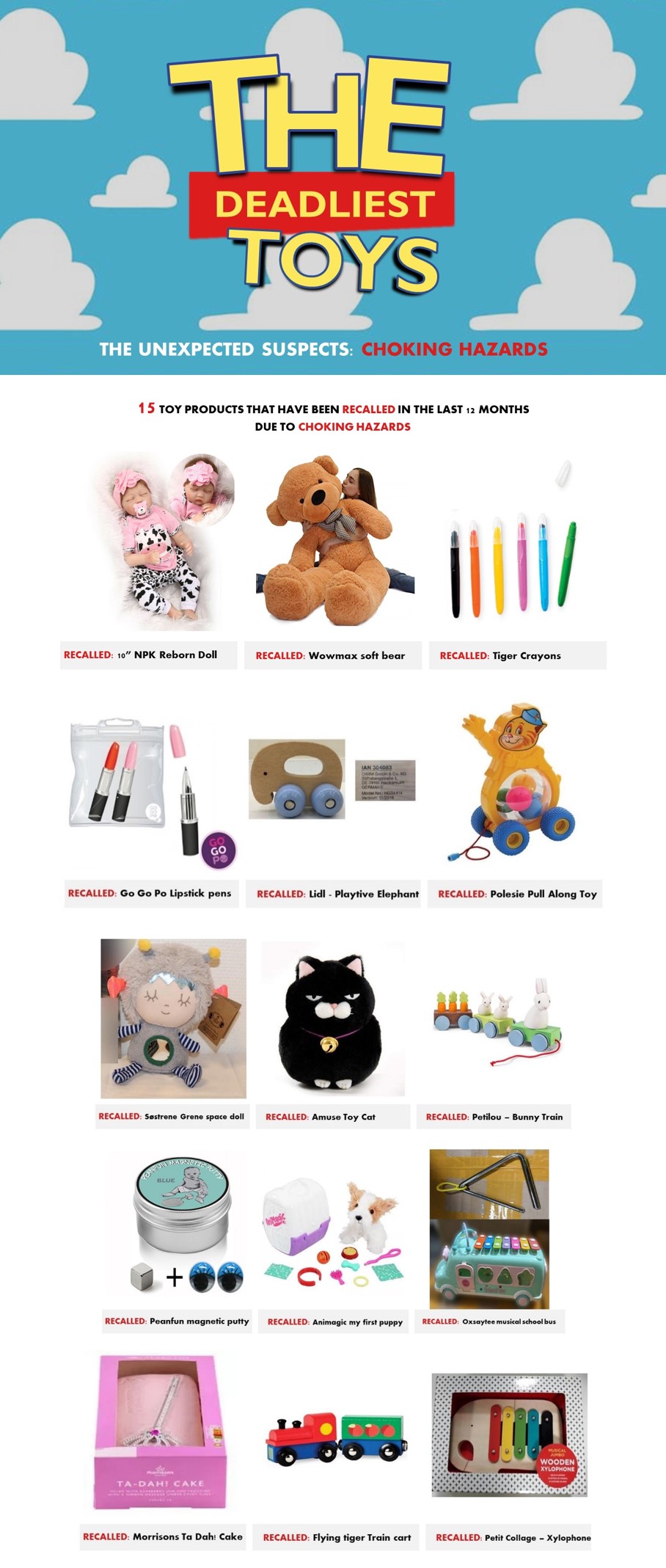 Many toys are smaller than this and can be a high risk around children. Trading Standards have recalled thousands of toys over the years due to them being a choking hazard and we have compiled a list of the deadliest from the last 12 months…