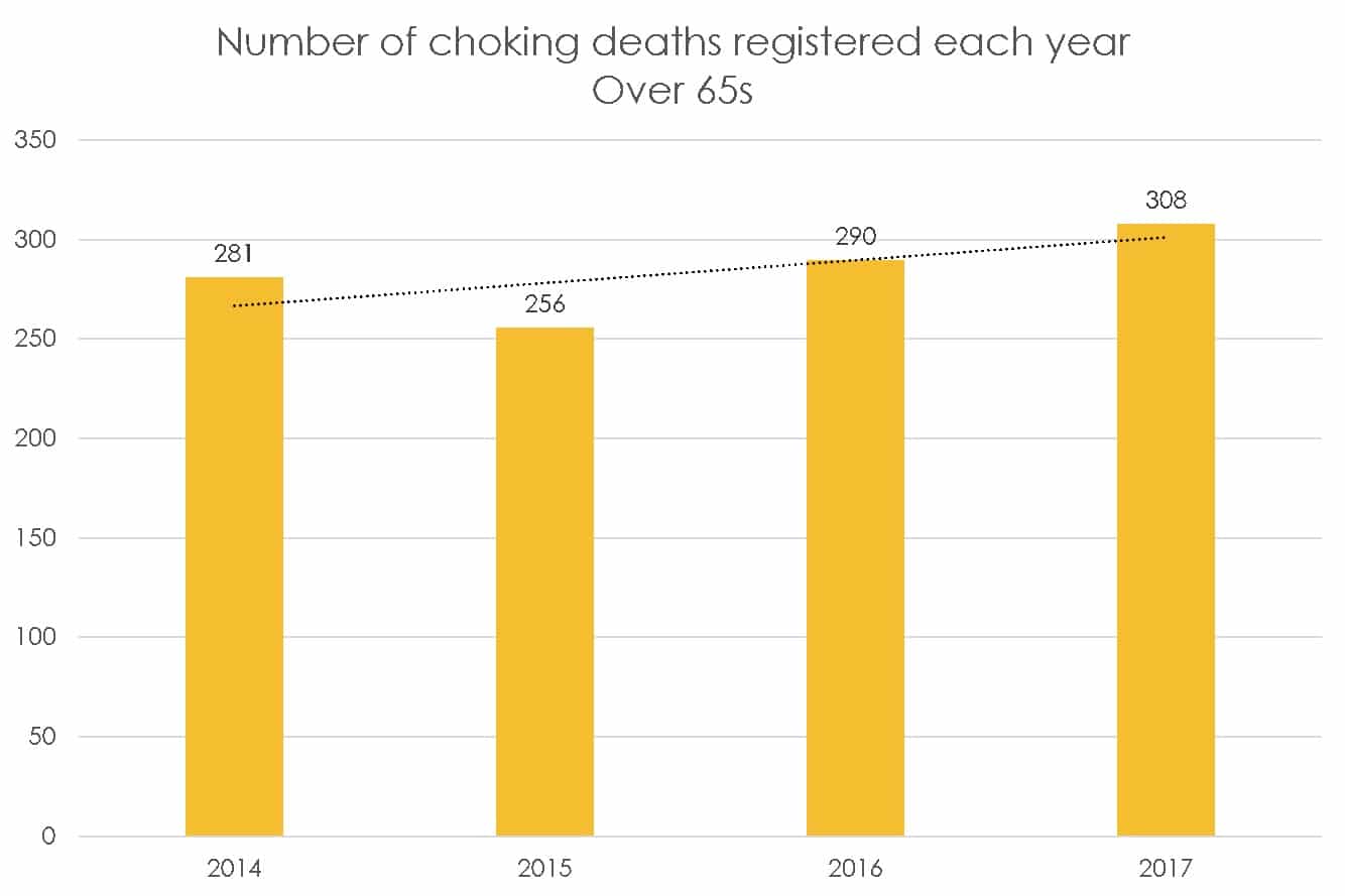 According to ONS, 308 over 65s have died in the last year as a result of choking, up 6% since the previous year. Since 2015, the number of elderly people dying from choking has risen by a shocking 20% with most occurring within hospitals, at home or care homes.